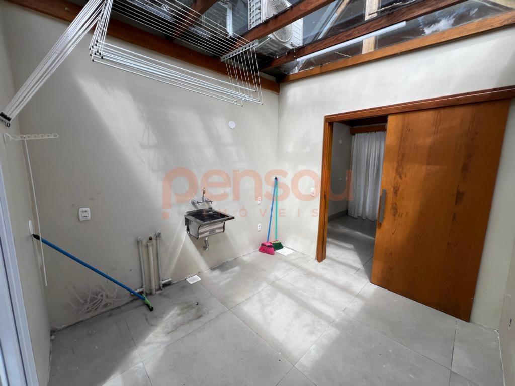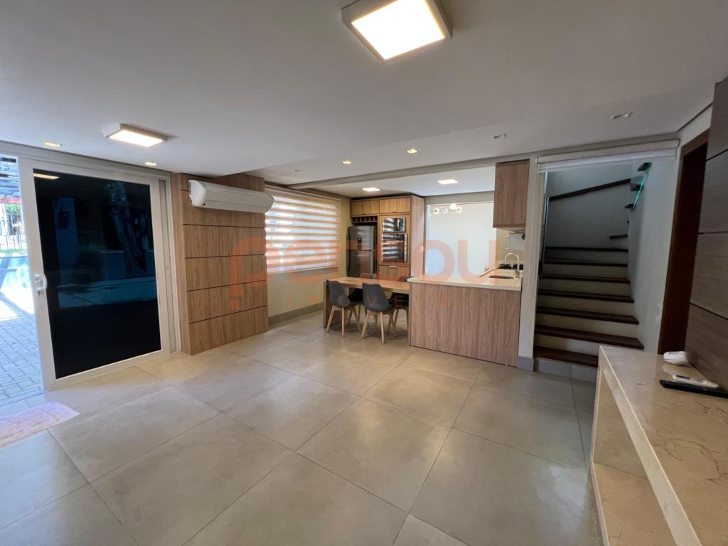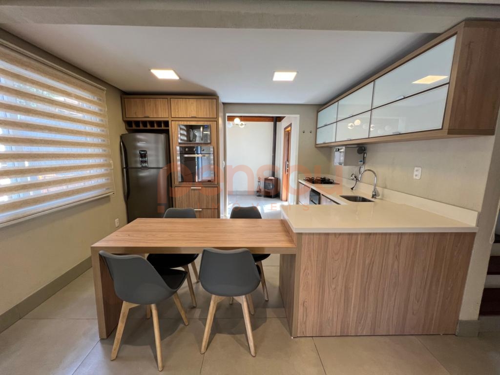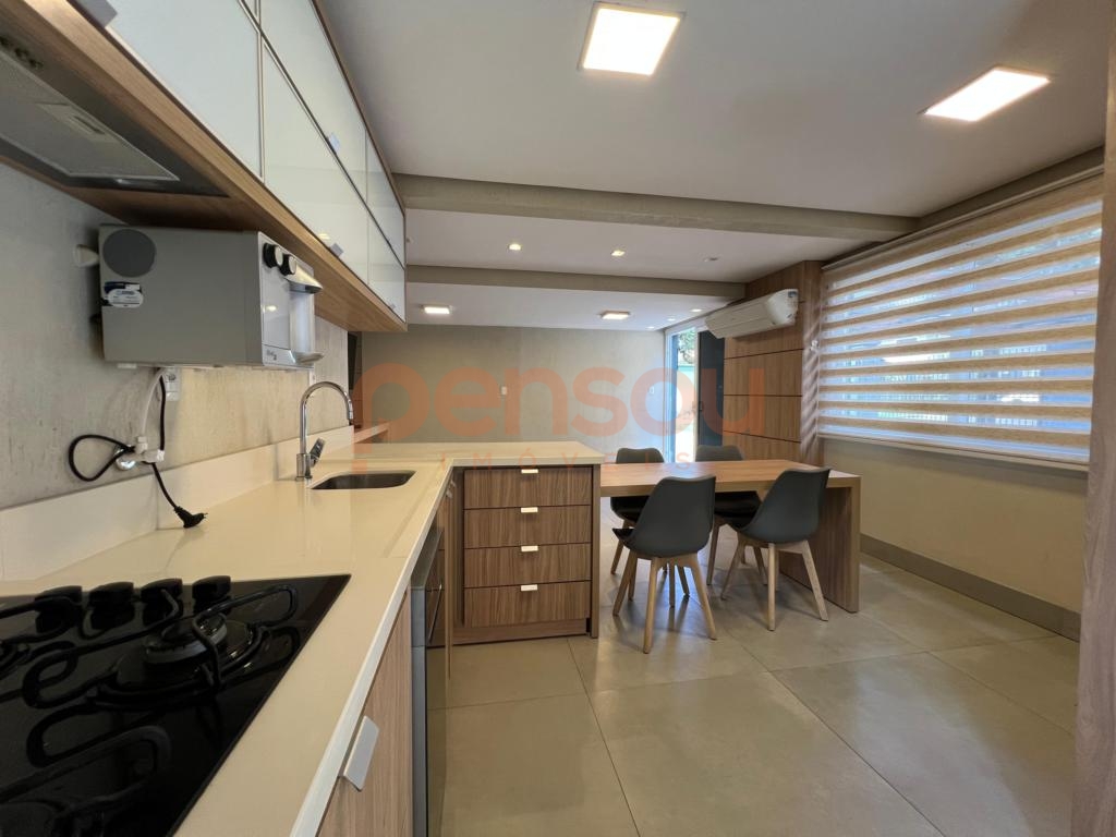 Ambientes integrados, sala de estar com lareira em mármore, jantar com calefator a lenha e cozinha equipada com eletrodomésticos de qualidade. Área gourmet com churrasqueira e mesa para oito lugares, além de pátio privativo de 40,50m² ideal para momentos em família.