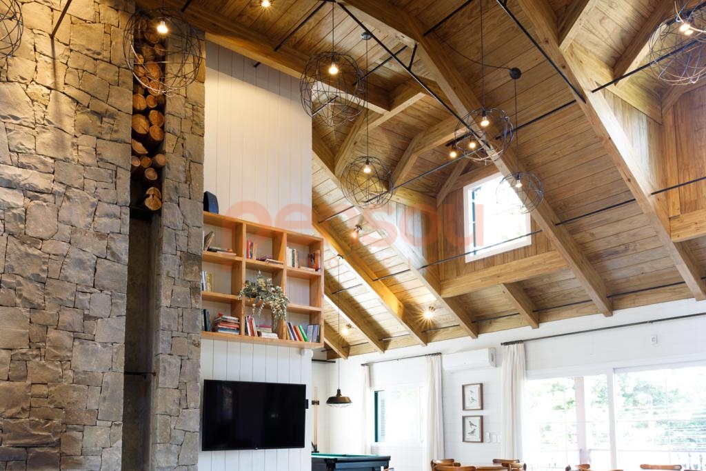interior um moderno espaço gourmet, com área kids, área fitness, estar com lareira e jogos, tudo isso integrado a um deck externo e playground para curtir os momentos ao ar livre com sua família.