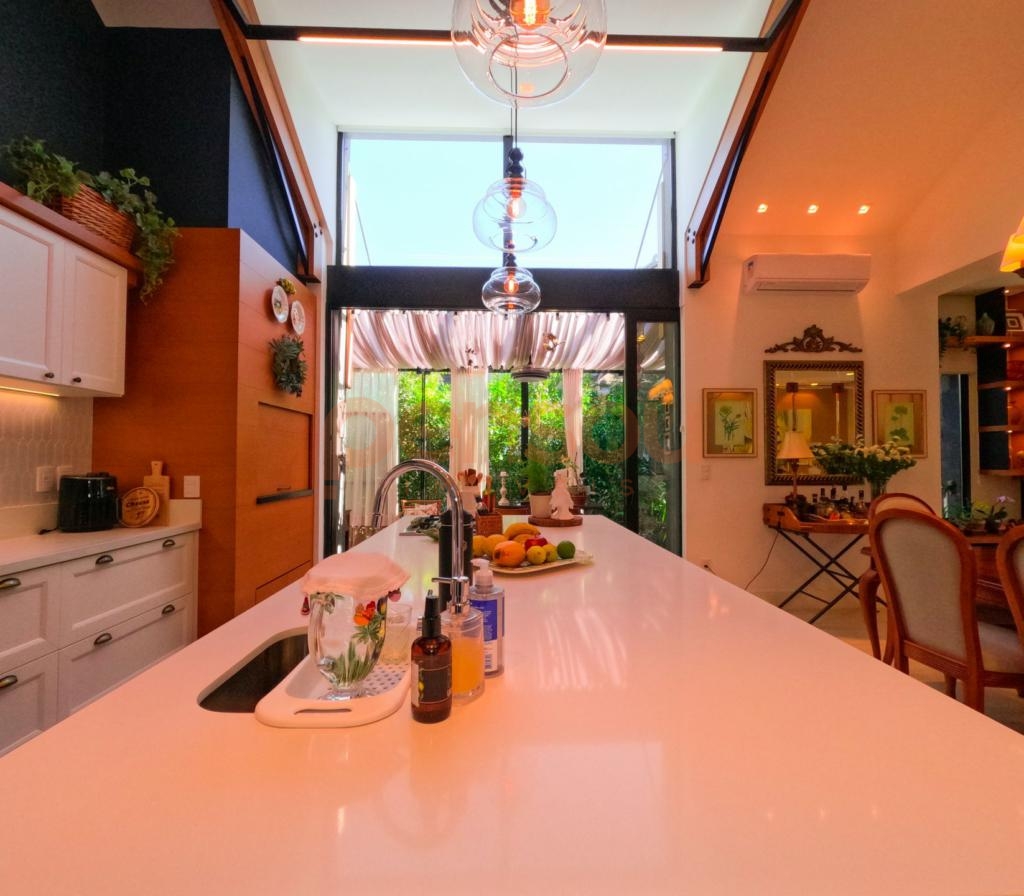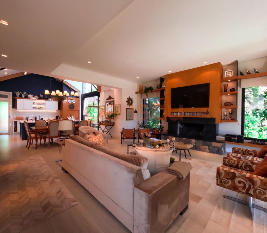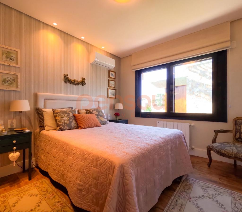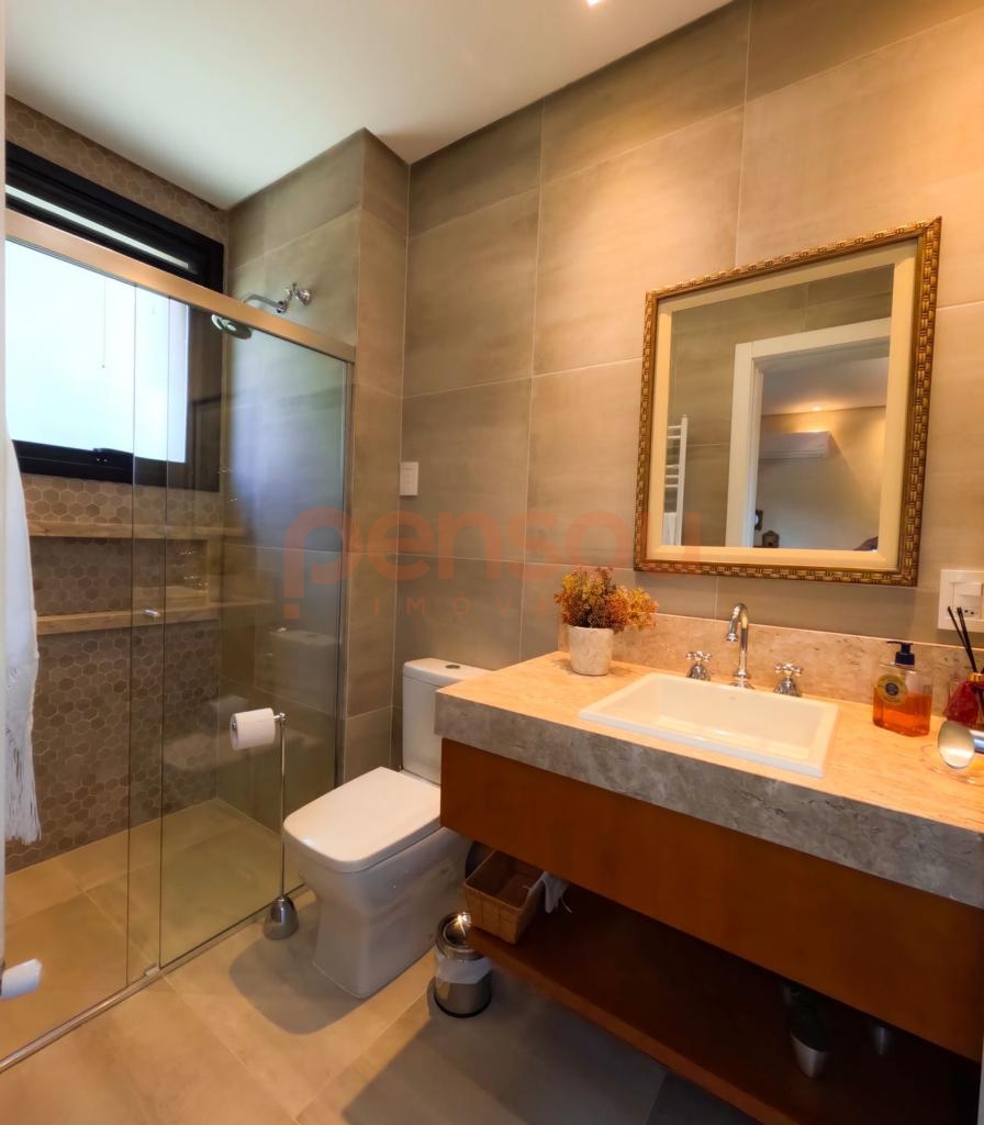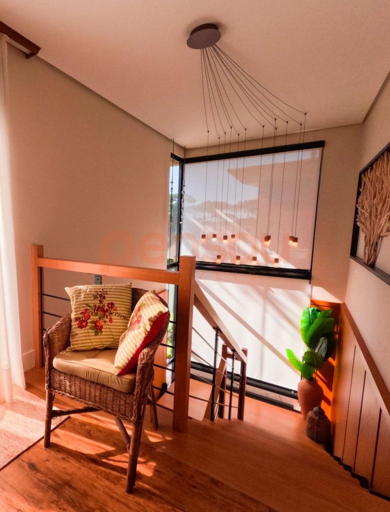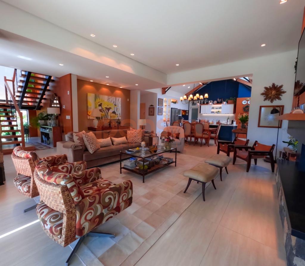 Excelente e ampla Casa com 300m² privativos, mobiliada, composto de 03 suítes, sendo 02 térreas e uma master, lavabo, cozinha com churrasqueira integrada com área social, solarium com vista para natureza, ampla sala de estar e jantar com lareira, e sacada com linda vista para área de lazer do condomínio, escritório e living íntimo piso superior.