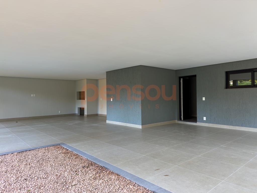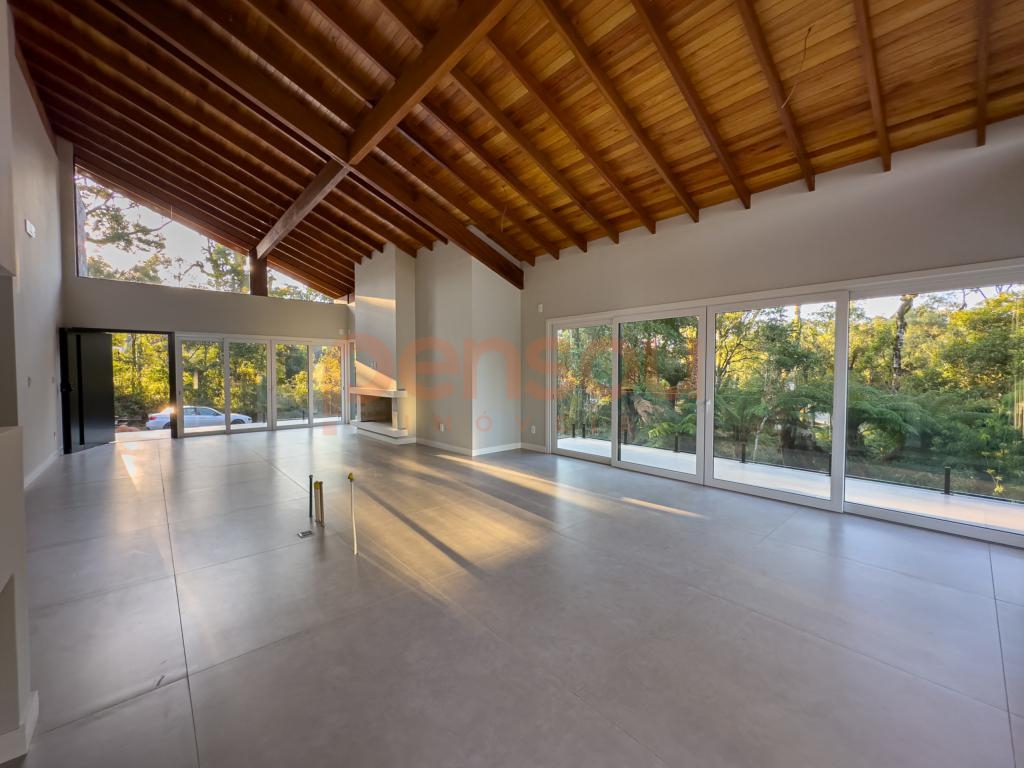 A casa conta com três suítes amplas, todas com persianas automatizadas, além de um lavabo social. Os ambientes sociais são integrados, reunindo sala de estar, jantar e cozinha gourmet, que se conectam a uma varanda generosa voltada para a área verde. No térreo e subsolo há lavanderia, depósito e despensa, garantindo praticidade no dia a dia.
