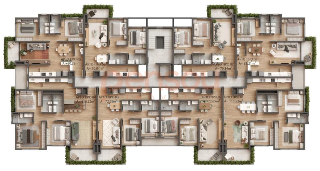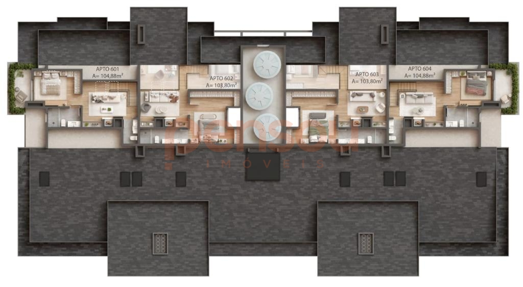 Apartamentos: Acabamento em gesso, Aquecimento a Gás, Área de Serviço, Banheiro Social, Churrasqueira, Cozinha, Espera para split, Fechadura com senha na porta de entrada, Gás Individual, Hidrômetro Individual, Infraestrutura para água quente, Lareira, Lavabo, Living, Mezanino, Piso aquecido nos banheiros, Porcelanato, Sacada, Sala de Estar, Sala de jantar, Varanda e Vista Panorâmica.