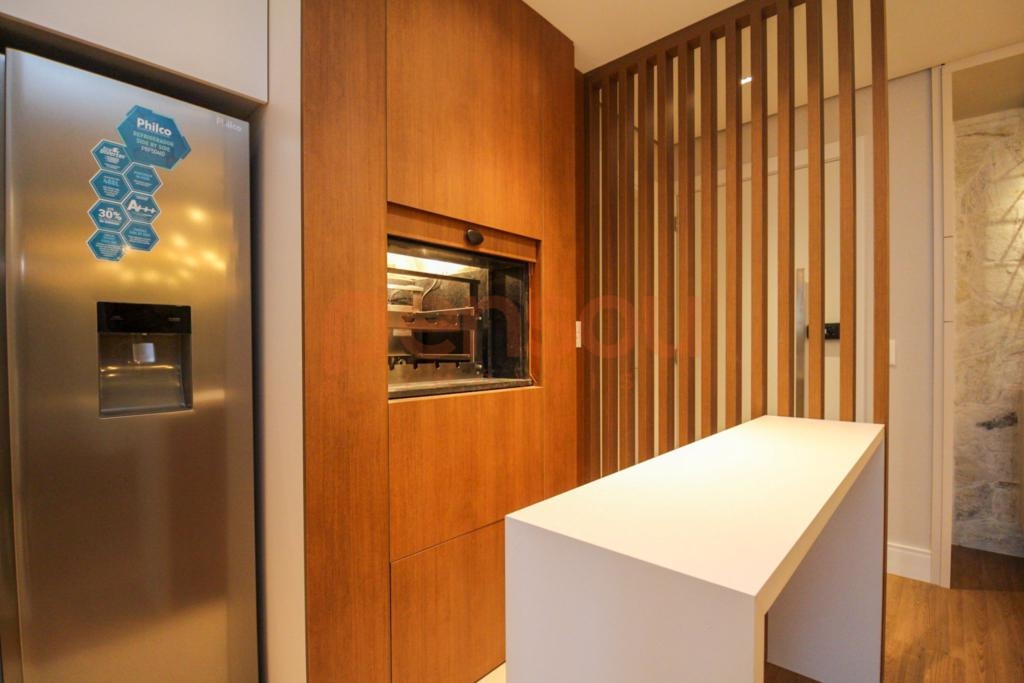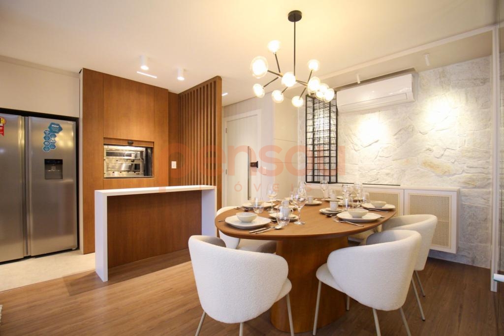 Sala de jantar integrada e cozinha americana com churrasqueira