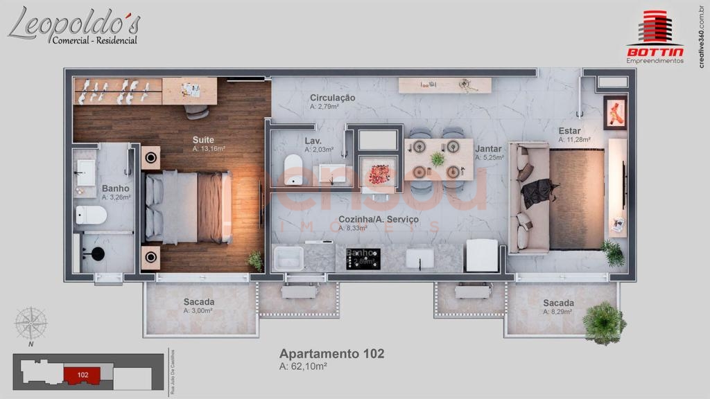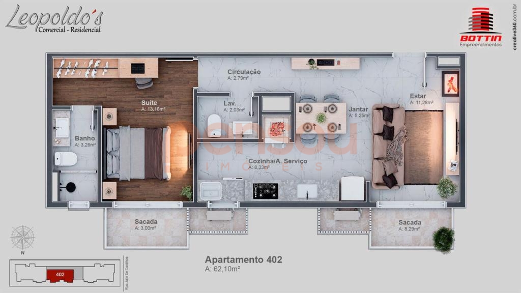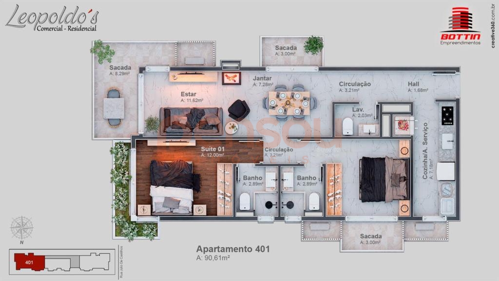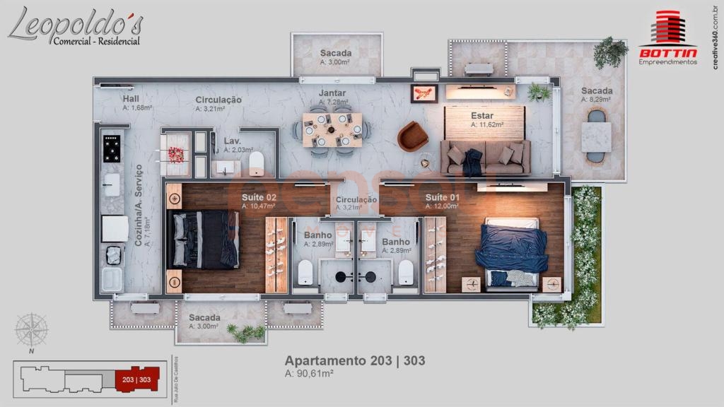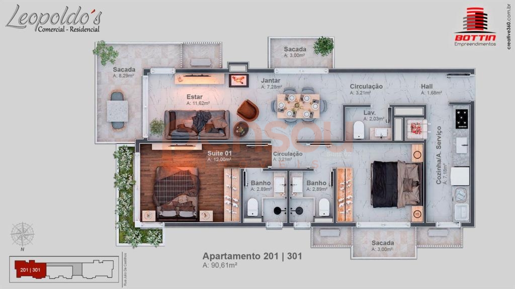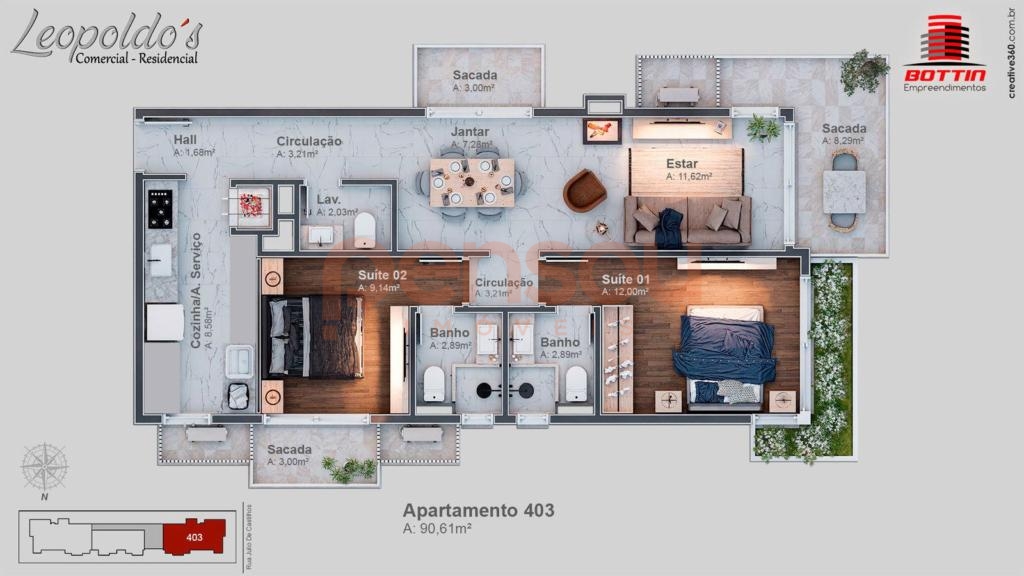 Amplo apartamento com çduas suítes, Lavabo, cozinha e área de serviço, sala de jantar e estar. O apartamento terá piso flutuante nas áreas secas e porcelanato nas áreas úmidas, ainda todo com acabamento em gesso, janelas em pvc e esperas para split, lareira e calefator.