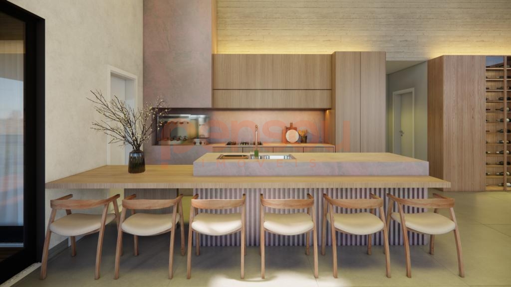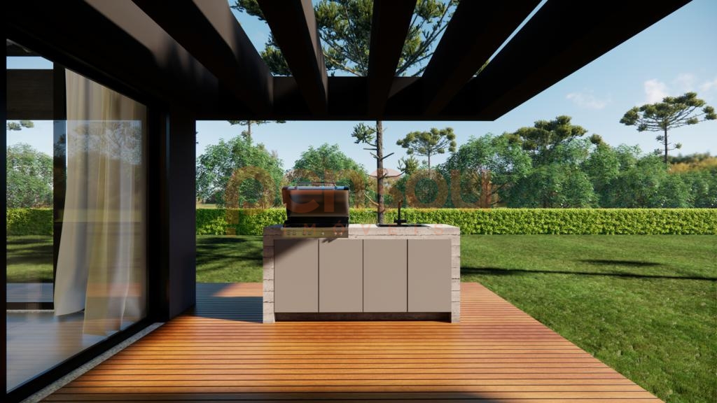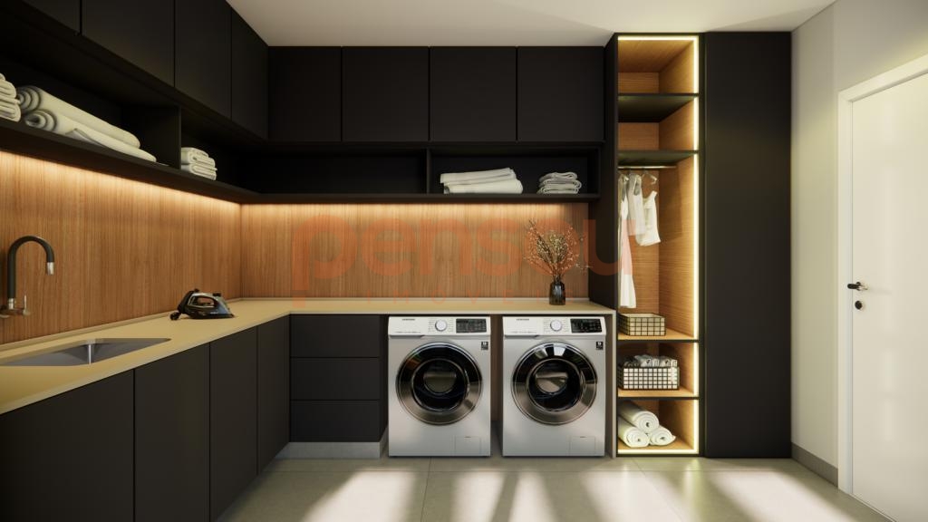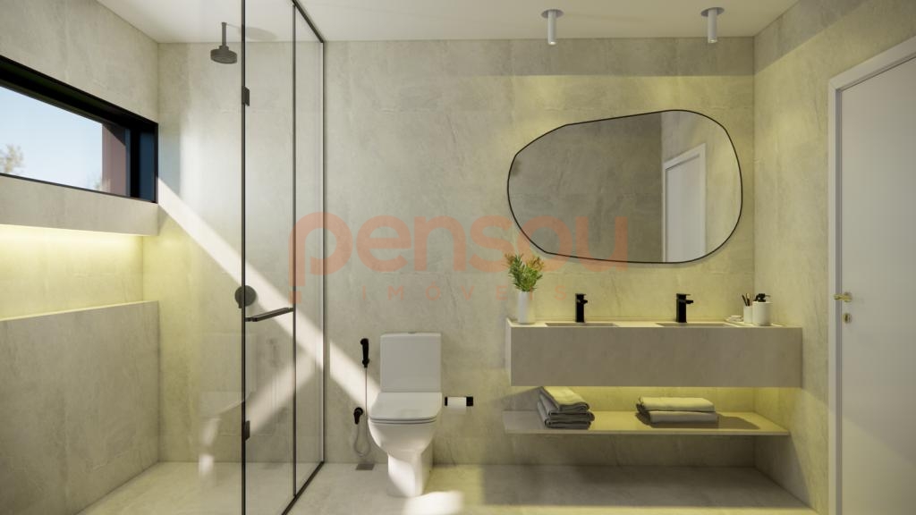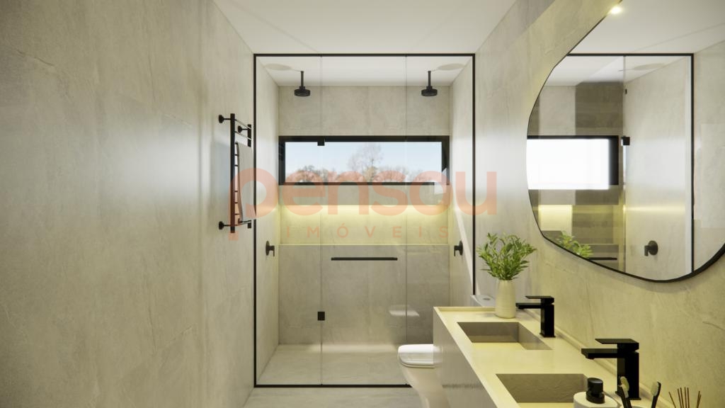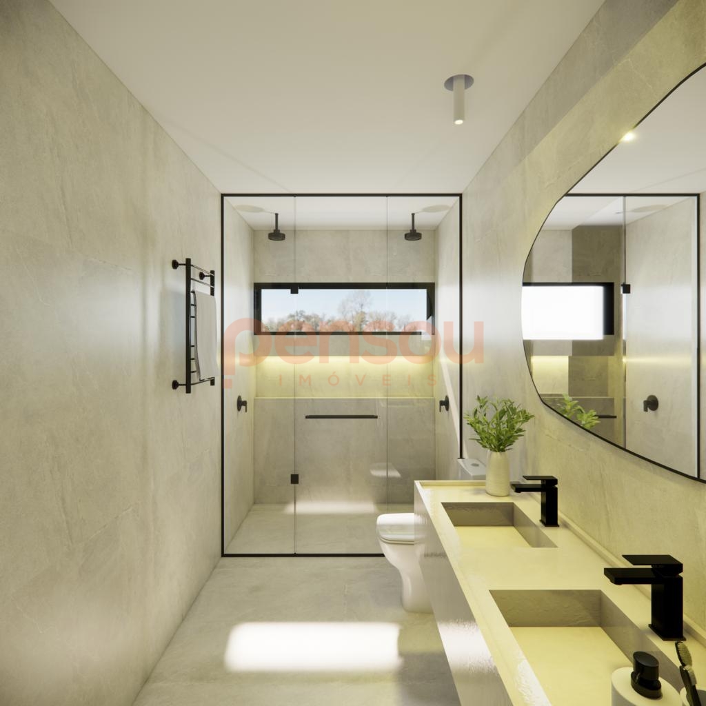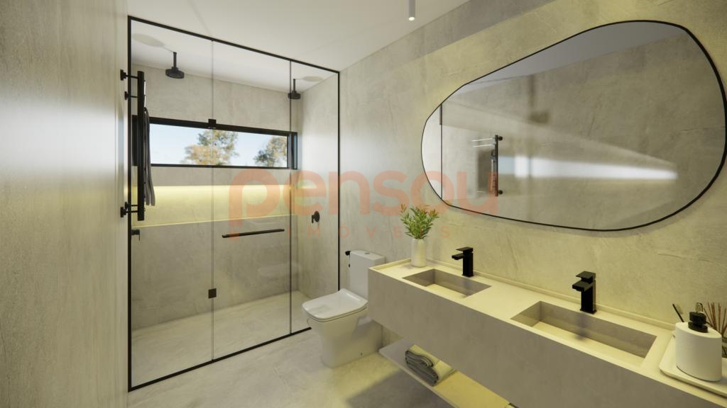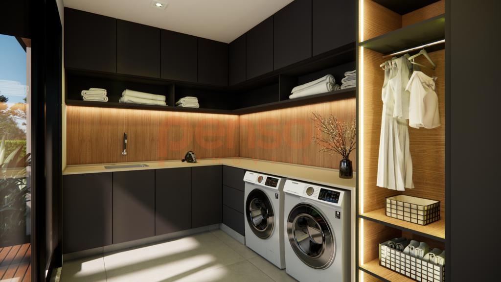 A residência traz diferenciais de alto padrão, como esquadrias em PVC preto com vidros duplos, piso aquecido nos banheiros, porcelanato em grandes formatos nas áreas sociais e piso vinílico nos dormitórios. Além disso, conta com esperas para calefação, energia fotovoltaica, aquecimento solar, sistema de água quente e instalação de splits. A lavanderia com acesso direto ao deck agrega ainda mais funcionalidade ao dia a dia.