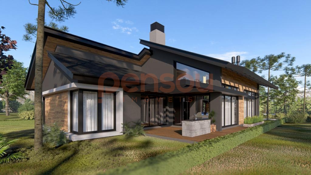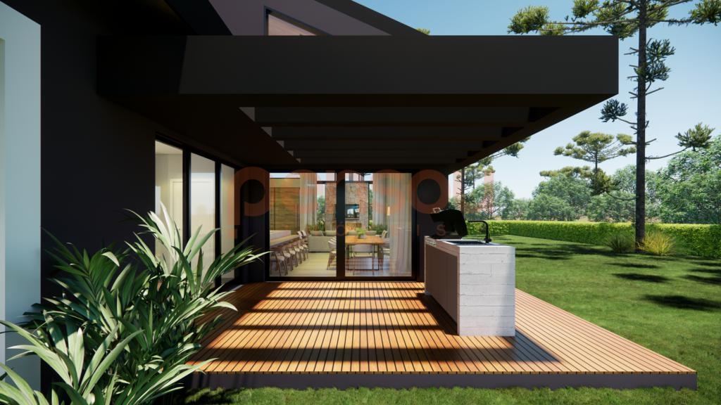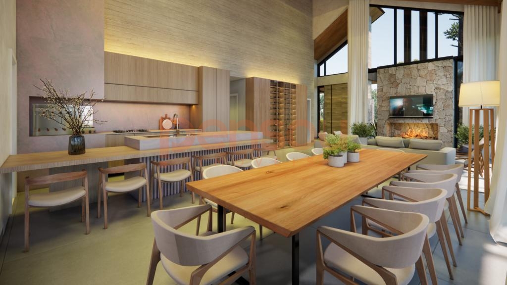 Com 250,08m² de área construída, o projeto contempla três suítes, incluindo uma suíte master com cuba dupla e ducha dupla no teto, além de um lavabo e duas vagas de garagem cobertas. O living se destaca pelo pé direito elevado e amplas aberturas, garantindo iluminação natural abundante e integração perfeita entre os ambientes internos e externos. A sala de estar com lareira em dois ambientes se conecta à cozinha com churrasqueira e ao deck com parrilla, criando um espaço ideal para confraternizações em família.