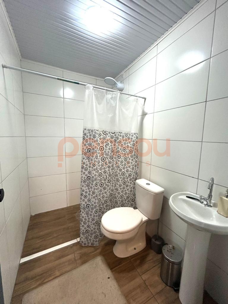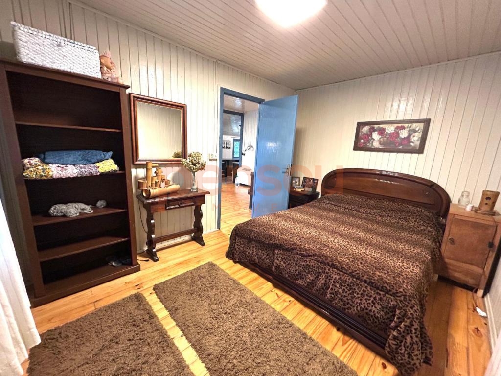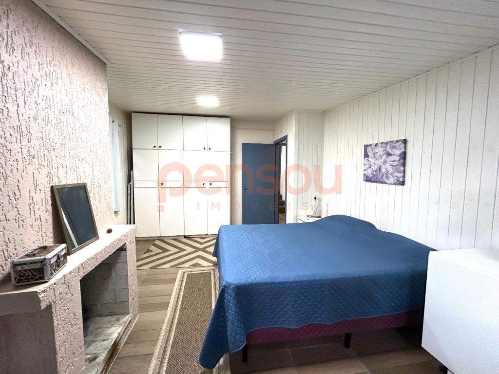 - Parte superior: cozinha integrada à sala de estar, bar, varanda, lareira, banheiro com aquecimento a gás e dois dormitórios amplos