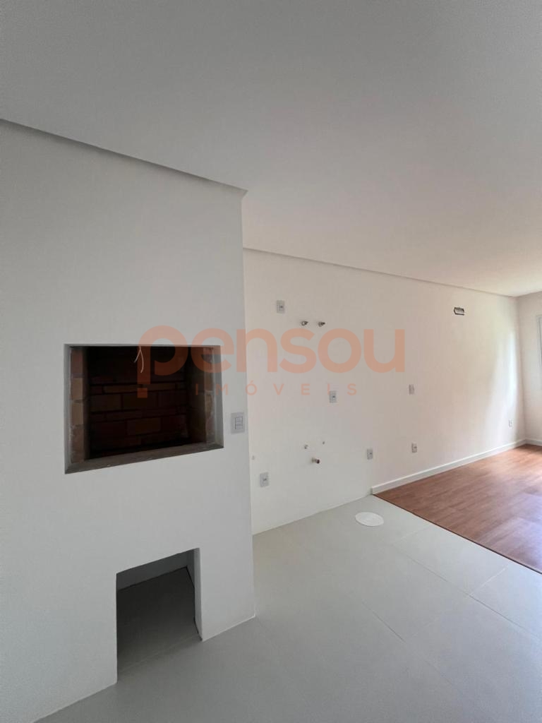 Apartamento com um dormitório e banheiro social, cozinha com churrasqueira, sala de estar e jantar integradas. O apartamento possui acabamenrtos em gesso, piso flutuante e porcelanato nas áreas úmidas e esperas para split.