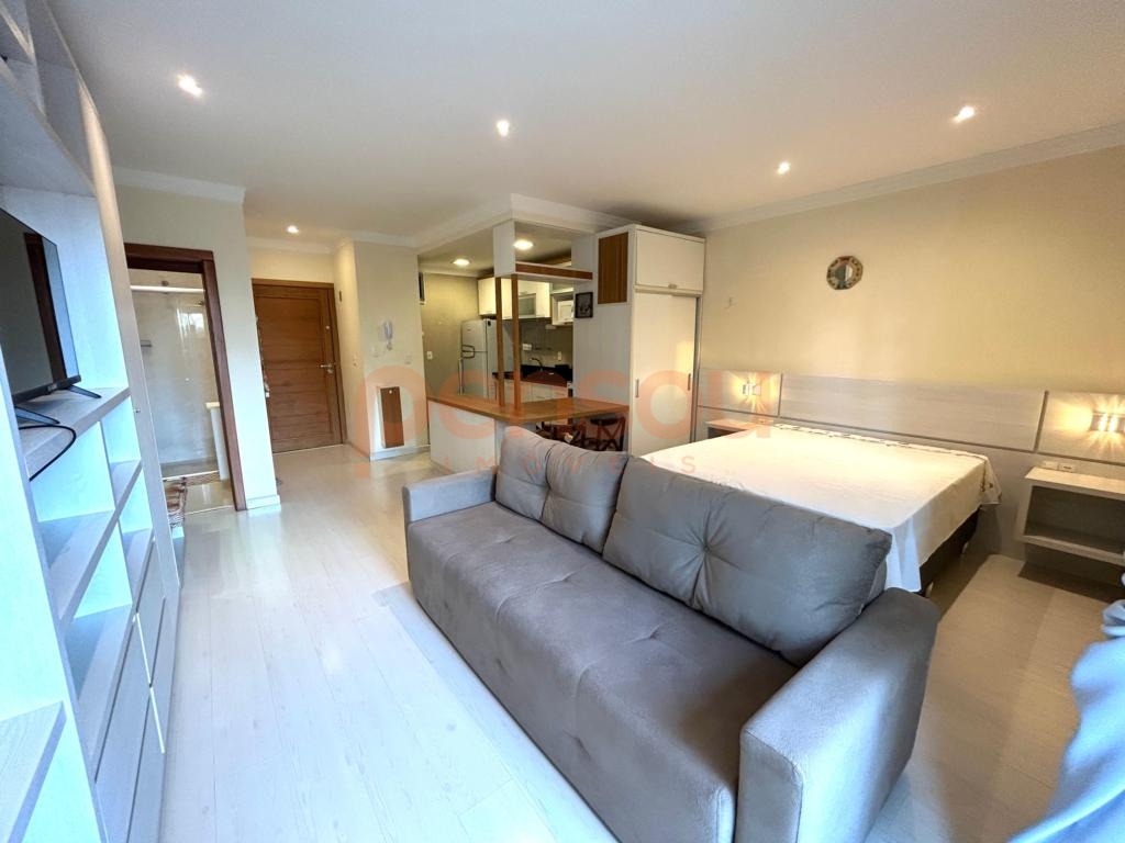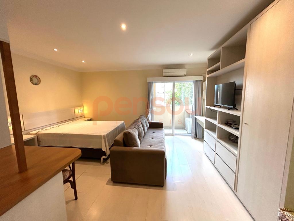 Conta com 01 dormitório, sala de estar com lareira, cozinha integrada estilo americana, sacada com churrasqueira, área de serviço, banheiro social, split instalado, mobiliado com moveis sob medidas e com 01 vaga de garagem.