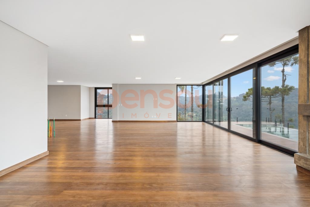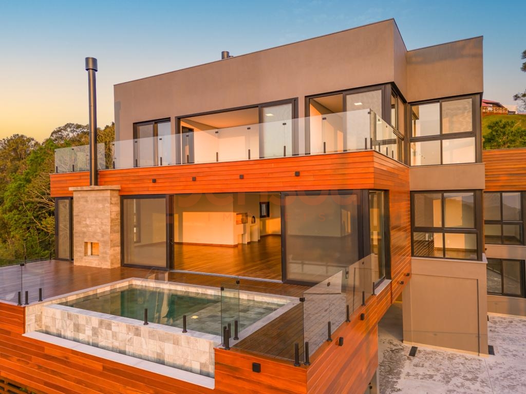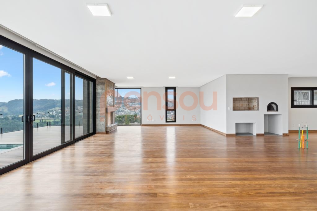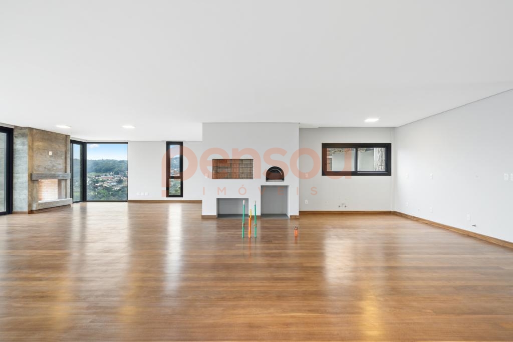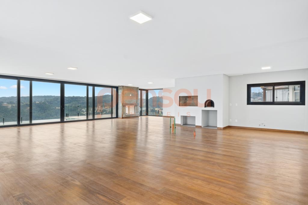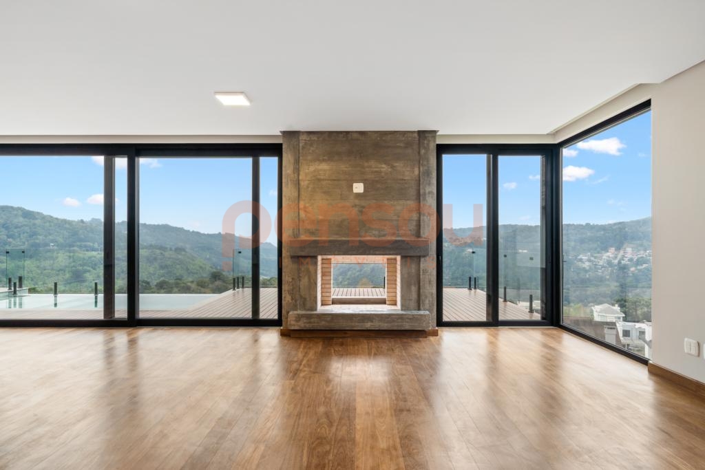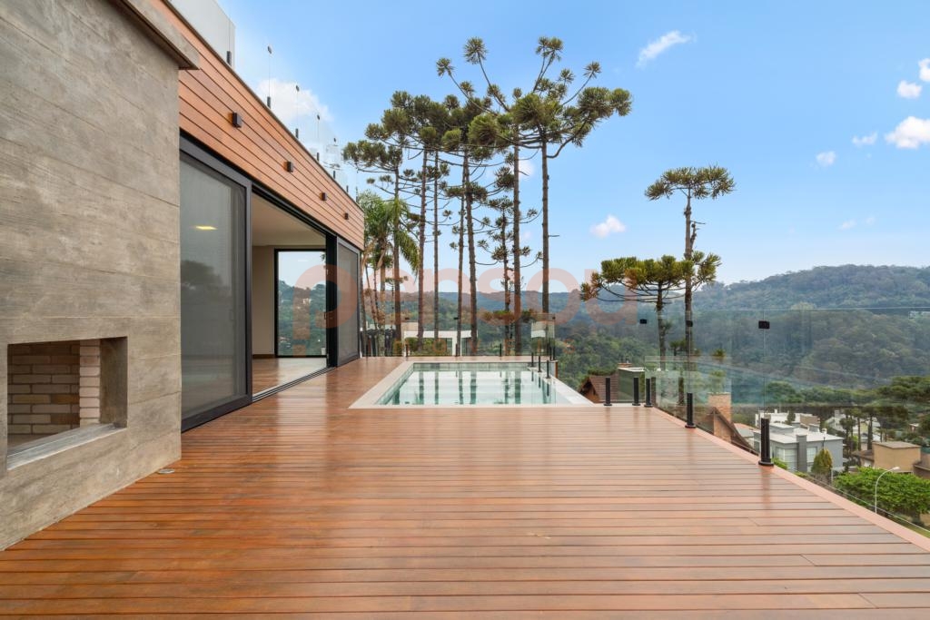 O grande destaque fica por conta do deck com piscina de borda infinita e vista panorâmica, além da lareira externa que proporciona momentos únicos ao pôr do sol. Paisagismo completo e quatro vagas de garagem complementam o imóvel.